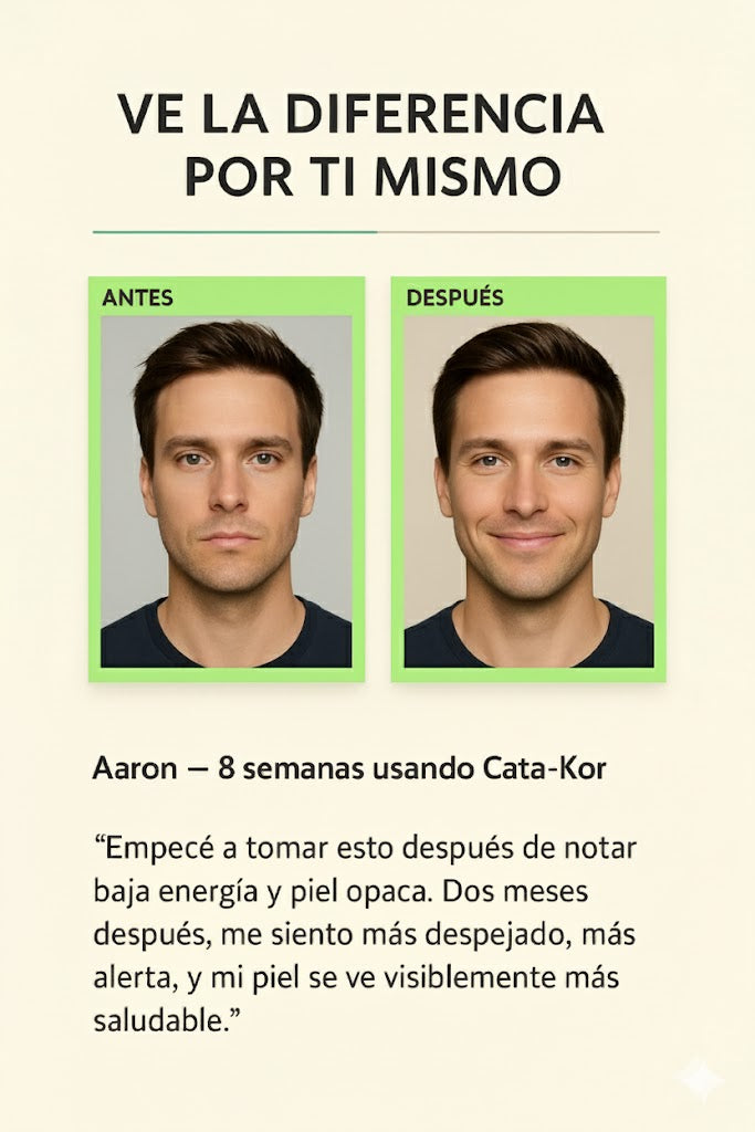 ¿Cansancio y piel sin brillo? Es hora de un cambio. Cata-Kor está diseñado para combatir la baja energía y la tez opaca. Quienes lo usan reportan sentirse más despejados, alertas y con una piel visiblemente más saludable en solo 8 semanas.